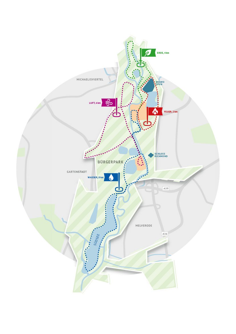 Die Teilnehmerinnen und Teilnehmer können vier unterschiedliche Themenstrecken beim Spazieren, Walken oder Laufen absolvieren: Wasser (8 km), Luft (6 km), Erde (4 km) und Feuer (2 km – vorgesehen für Kinder und Menschen mit eingeschränkter Mobilität). Die Routen führen in unterschiedlichen Himmelsrichtungen durch den Bürgerpark Braunschweig, starten und enden allesamt an der Hauptveranstaltungsfläche am BRAWO OPEN-Gelände.