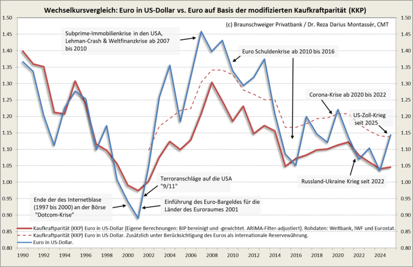 Aktuell errechnen wir auf Basis unseres modifizierten KKP-Modells einen theoretischen Wert des Euros von 1,05 US-Dollar. Unter Berücksichtigung des Euros als Reservewährung liegt der Wert bei höheren 1,14 US-Dollar.