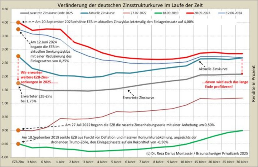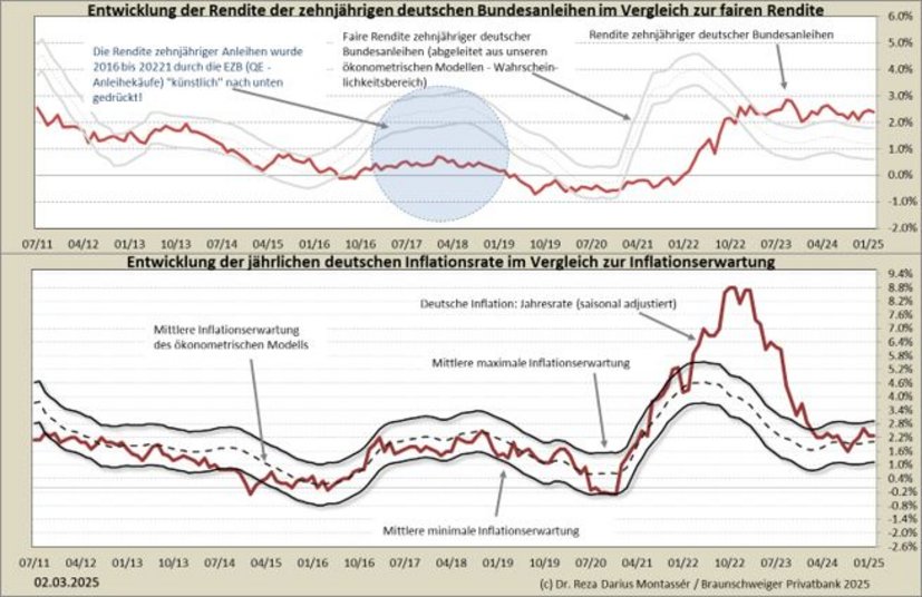 Haftungsausschluss und Disclaimer: Die bereitgestellten Informationen beruhen auf Quellen, die wir für verlässlich halten. Wir übernehmen jedoch keine Gewähr für die Richtigkeit, Vollständigkeit oder Aktualität dieser Informationen. Diese Veröffentlichung dient ausschließlich der allgemeinen Information und ersetzt auf keinen Fall die anleger- und produktbezogene Beratung. Jede – auch auszugsweise – Verwertung, die nicht ausdrücklich vom Urhebergesetz zugelassen ist, bedarf der vorherigen Zustimmung der Braunschweiger Privatbank. Dies gilt insbesondere für die Vervielfältigung, Verbreitung, Bearbeitung, Übersetzung, (Mikro-) Verfilmung und die Einspeicherung in elektronische Geräte oder Systeme. Wir haben uns bemüht, alle Angaben sorgfältig zu recherchieren und zu erarbeiten. Dabei wurde zum Teil auf Informationen Dritter zurückgegriffen. Einzelne Angaben können sich insbesondere durch Zeitablauf oder infolge von gesetzlichen Änderungen als nicht mehr zutreffend erweisen. Für die Richtigkeit, Vollständigkeit und Aktualität sämtlicher Angaben kann daher keine Gewähr übernommen werden. Das gesamte Research stellt lediglich unsere Meinung dar, die ohne unsere Vorankündigungen wieder geändert werden könnte. Sofern Aussagen über Renditen, Kursgewinne oder sonstige Vermögenszuwächse getätigt werden, stellen diese lediglich Prognosen dar, für deren Eintritt wir keine Haftung übernehmen. Dieses Research fordert weder zum Kauf noch zum Verkauf irgendwelcher Finanzinstrumente oder Wertpapiere auf. Soweit steuerliche oder rechtliche Belange berührt werden, sollten diese vom Adressaten mit seinem Steuerberater bzw. Rechtsanwalt erörtert werden. Herausgeber: Braunschweiger PrivatbankWilly-Brandt-Platz 19, 38102 Braunschweig. Verantwortlich im Sinne des Presserechts: Dr. Reza Darius Montassér, CMT. Redaktionsschluss: 03.03.2025.